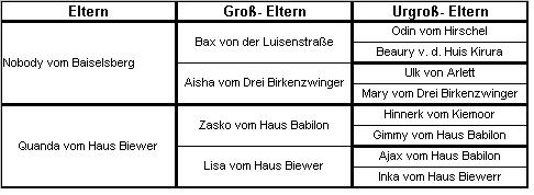 Vater: Nobody vom Baiselsberg Mutter: Daica v. Haus Duopnt